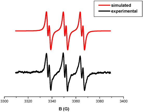 The presence of Ar● (r2) is fully confirmed by ESR results. Indeed, the phenyl radicals (Ar●) were easily detected as PBN/Ar● radical adducts in the irradiation of a Cd7/Iod solution in ESR-ST experiments (Figure 9) i.e., the simulation of the experimental ESR spectrum yields the hyperfine coupling constants (hfcs): aN = 14.13 G and aH = 2.21 G typical for the PBN/Ph● radical adducts.