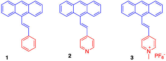 The synthetic routes towards the desired 9-styrylanthracene-derived fluorophores (dyes 1–3, Figure 2) and their characterization data are detailed in the Experimental section. In general, the core structures of these dyes could be conveniently synthesized using the palladium-catalyzed Heck coupling reaction, which linked the corresponding vinyl moieties to the anthracene system via a C=C double bond. Importantly, this reaction enabled synthesis of optically pure stereoisomers owing to its stereo-selectivity towards the trans-configuration. The synthesis of dye 1 was achieved by adapting the ligand-free Heck reaction strategy reported by Yao et al. [25], where the catalyst system consisted of Pd(OAc)2 and K3PO4 in dimethylacetamide (DMA) without any triaryl phosphine ligand. On the other hand, dye 2 was synthesized following the traditional Heck reaction strategy in the presence of the ligand PPh3 [22]. The positively charged dye 3 was simply prepared from dye 2 by refluxing in CH3I, followed by ion exchange in the presence of KPF6 as described in the Experimental section. All products were characterized by 1H- and 13C-NMR and mass spectrometry.