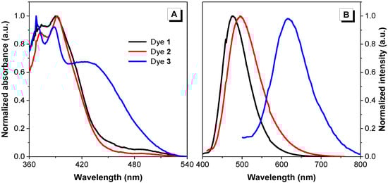 As all dyes were found soluble in dimethyl sulfoxide (DMSO), their fluorescence properties were first measured in this solution. Their absorption profiles were analyzed by normalized absorption spectra (Figure 3A). Dyes 1 and 2 reached maximal excitation at very similar wavelengths (390 and 392 nm, respectively), while dye 3 exhibited a slight blue-shift and a second absorption maximum at about 420 nm. Subsequently, their emission spectra were measured after exciting the dyes at their recorded absorption maxima (Figure 3B). Dyes 1 and 2 exhibited emission maxima at 475 and 495 nm, respectively, with the absolute quantum yields of 0.60 and 0.03, respectively; however, dye 3 showed a marked red-shift with the maximum at 618 nm when excited at 420 nm with a quantum yield of lower than 1% in DMSO solution.