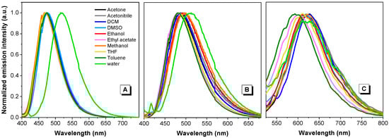Normalized emission spectra of dyes 1 (A), 2 (B) and 3 (C) in different solvents. Concentration = 10 µM.