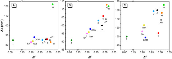 The Stokes shift of all dyes as a function of solvent polarity was graphed in the Lippert–Mataga solvatochromism plot (Figure 5A–C) [26]. It can be observed that, in general, the Stokes shifts of dyes 2 and 3 are mostly proportional to the solvent polarity, suggesting both dyes possess positive solvatochromism, whereas the Stokes shift remained almost unchanged in different solvents with the exception of dye 1 in water.