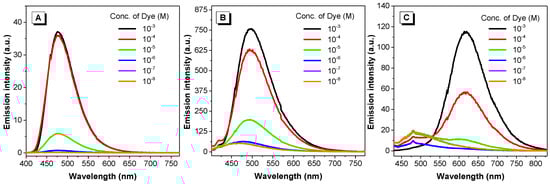 Emission spectra of dyes 1 (A), 2 (B) and 3 (C) at various concentrations in DMSO. Excitation wavelength: 390, 392 and 420 nm, respectively.