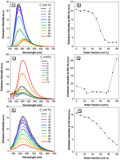 Emission intensity of dyes 1 (A,B), 2 (C,D) and 3 (E,F) in methanol/water mixtures with different water fractions. Concentration = 10 µM. fw and vol% = water fraction. λex: 385, 387 and 437 nm respectively.