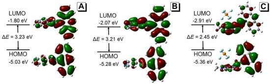 Molecular orbital amplitude plots and the HOMO/LUMO energy levels of 1 (A); 2 (B) and 3 (C) calculated using the B3LYP/6-31G basis set.