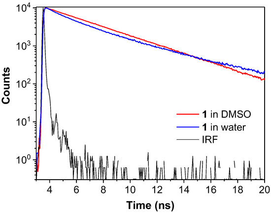 Fluorescence decay profile of dye 1 in DMSO (red) and water (blue). The black line shows the instrument response function (IRF) of the measurement system. Dye concentration: 10 μM. λex: 400 nm. λem: 480 nm for DMSO and 520 nm for water.