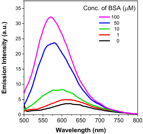 Fluorometric methods for protein detection and quantification are becoming increasingly used in research fields, owing to their satisfactory sensitivity, low background noise and wide dynamic ranges. Protein binding onto AIE-active dyes has been shown to enhance emission intensity [42]. In this work, we selected dye 3 for investigation as its positive charge enabled comparatively higher aqueous solubility than dyes 1 and 2. Its interaction with a model protein, bovine serum albumin (BSA), was analysed in a pH 7.0 phosphate buffer. As illustrated in Figure 12, dye 3 was only weakly emissive in buffer solution in the absence of BSA. Addition of BSA progressively intensified its fluorescence emission, with the emission maxima shifting from 620 nm to 575 nm. As BSA contains hydrophobic binding pockets in its native folded structure, we speculated that the intramolecular rotation of BSA-bound dye 3 had been hindered, hence emitting in a manner similar to that observed in an aggregated state. Meanwhile, the blue-shift of the spectra indicated the transition from a hydrophilic to hydrophobic environment of the dye molecules. These observations again proved that dye 3 is AIE-active and therefore is a valuable candidate for protein fluorescent detection and quantification in proteomics.