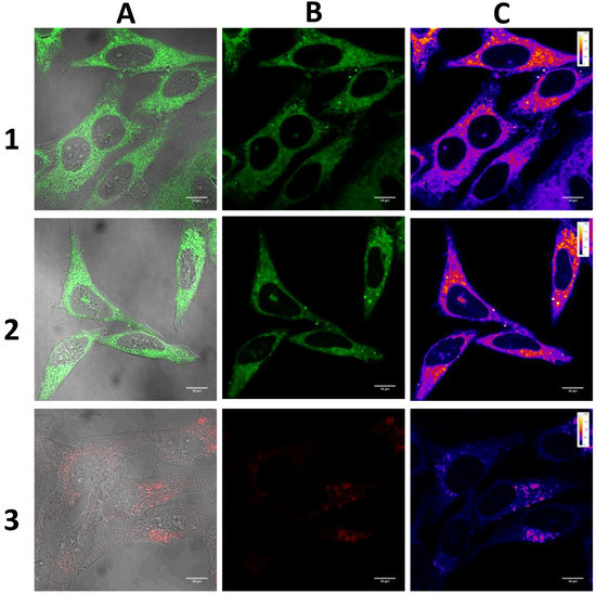 All dyes were assessed to determine their potential as luminescent probes for bioimaging. We stained live HeLa cells with dyes 1, 2 and 3 and fixed the cells before conducting confocal microscopy bioimaging. The results indicated that all the dyes were capable of entering the cytoplasm, but only 1 and 2 displayed some nuclear penetration (Figure 13). This could be largely due to the anthracene group, which is able to be taken up by lysosomes and then released into the nucleus along with lysosomal deoxyribonuclease upon prolonged exposure to light [43]. Additionally, there was little or no background fluorescence when stained with these three dyes. This further validated their bioimaging potential as dyes 1, 2 and 3 were able to enter cells whilst exhibiting no off-target fluorescence. To visualise the intensity of their luminescence, we then used the Fire lookup table (LUT) colour scheme on the Fiji software (ImageJ2, LOCI, Madison, WI, USA) to compare their linearized pixel values in the display range (0–255 a.u.). Results revealed that the luminescence intensity of dyes 1 and 2 were relatively similar, with dye 3 exhibiting the least intense luminescence (Figure 13C). Moreover, luminescence was only visible when dye 3 was excited with a higher laser power (6.0%) compared with 1 and 2, which were both excited at a lower laser power (2.0%).