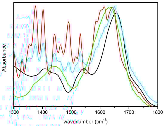 −1 were related to the C=O stretching in the various conformational environment of the protein (α-helices, β-sheets, β-turns and disordered structures, intermolecular β-strands). From the area of each of these components, it was possible to evaluate the percentage of the secondary structure elements for the four samples. The results are reported in