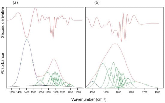 Figure 3 are illustrated the second derivative spectra of the amide I used as fit initial values and the best fit Gaussian components obtained for M-CRL2 (trace (b)) and M-CRL3 (trace (a)). Since in these spectra the amide I and amide II bands were partially overlapped, in the fitting procedure, the amide II was considered as a component of the amide I band. Moreover, in the spectrum of M-CRL2 the amide III band was partially overlapped with the amide II. Consequently, to avoid errors in the baseline correction, these two bands were included in the fitting procedure.