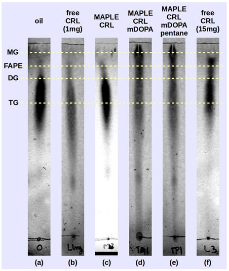 Preliminary tests of the deposited lipase samples were performed by transesterification reaction carried out between soybean oil and isopropyl alcohol using reverse phase thin layer chromatography (RP-TLC) to identify the reaction products. In