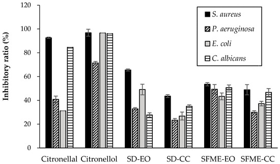 Inhibitory ratio (%) of ‘Mato Peiyu’ leaf essential oils (SD-EO and SFME-EO), citronellal, and citronellol against four microbial strains. SD-CC and SFME-CC were the mixtures of citronellal and citronellol, which were tested at concentrations determined according to composition ratios relative to the essential oils obtained through SD and SFME, respectively. SD-EO, SFME-EO, citronellal, and citronellol were measured at a concentration of 0.0500% (v/v). SD-CC and SFME-CC were measured at concentrations of 0.0254% and 0.0299% (v/v), respectively. Data are presented as the mean ± standard deviation based on triplicate determination.