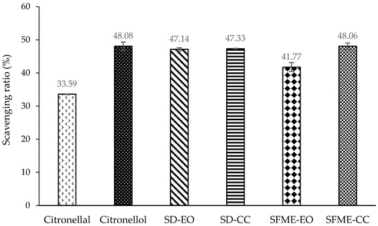 Diphenyl-1-picrylhydrazyl (DPPH) radical scavenging ratio (%) of ‘Mato Peiyu’ leaf essential oils, citronellal, and citronellol. SD-EO, SFME-EO, citronellal, and citronellol were measured at a concentration of 0.500% (v/v). SD-CC and SFME-CC were measured at concentrations of 0.254% and 0.299% (v/v) according to the composition ratios in 0.500% (v/v) SD-EO and SFME-EO, respectively. Data are presented as the mean ± standard deviation based on triplicate determination.