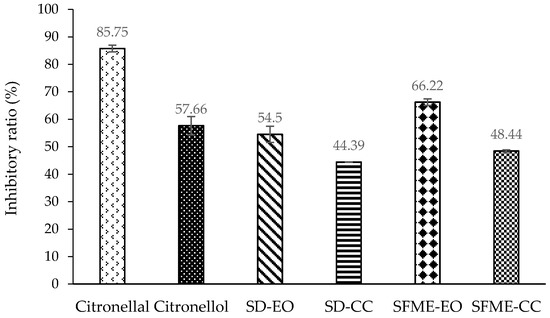 β-Carotene/linoleic acid inhibitory ratio (%) of ‘Mato Peiyu’ leaf essential oils, citronellal, and citronellol. SD-EO, SFME-EO, citronellal, and citronellol were measured at a concentration of 0.150% (v/v). SD-CC and SFME-CC were measured at concentrations of 0.076% and 0.090% (v/v) according to the composition ratios in 0.150% (v/v) SD-EO and SFME-EO, respectively. Data are presented as the mean ± standard deviation based on triplicate determination.