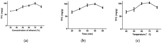 The effects of (a) concentration of ethanol; (b) extraction time; and (c) extraction temperature on the total flavonoid content (TFC) of the extract (N = 3).