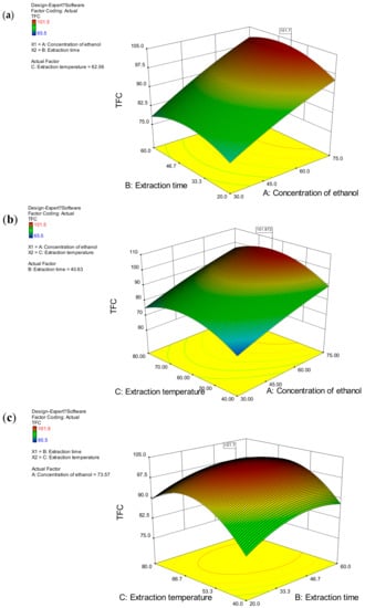 The graph of RSM was a 3D response surface plot consisting of response values of the experimental variables (Figure 2), which reflects the interactions between the variables (ethanol concentration, extraction time, and extraction temperature). The combined effect of ethanol concentration and extraction time was not significant; as can be seen in Figure 2a the effect of extraction time on the extraction rate of flavonoids was not very obvious at a given ethanol concentration as the surface is relatively flat. Figure 2b shows the 3D response surfaces for the combined effect of ethanol concentration and extraction temperature on TFC, and it reveals that at low ethanol concentration and high extraction temperature values, the TFC was minimal. When extraction temperature was at a certain value, the TFC increased with an increase in ethanol concentration. However, it was not significant that the increase in the extraction temperature affected the TFC at a certain ethanol concentration. As shown in Figure 3c, extraction time and extraction temperature demonstrated a quadratic effect on the response. Based on the results of the response surface plots and ANOVA, it is obvious that ethanol concentration was the main parameter influencing the TFC value.