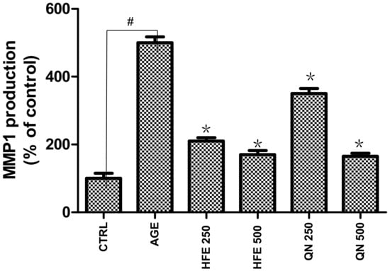 Effects of HFE and QN (quercitrin) on Matrix metalloproteinase 1 (MMP-1) expression in human skin keratinocyte (HaCaT) treated by advanced glycation end products (AGEs) for 24 h. Data are shown as the mean ± standard deviation (SD) of three independent experiments (Positive control: 24 h AGE-induced #: p < 0.05 compared to negative control; *: p < 0.05 compared to positive control by Student’s t-test).