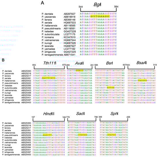Sequence alignment of rbcL (A) and rps11–trnG (B) regions from 15 Pyropia species obtained from GenBank (National Center for Biotechnology Information (NCBI), Rockville, MD, USA). The bases highlighted in yellow correspond to the Tth111I, AvaII, BsrI, BsaAI, HindIII, SacII, and SphI enzyme restriction sites.