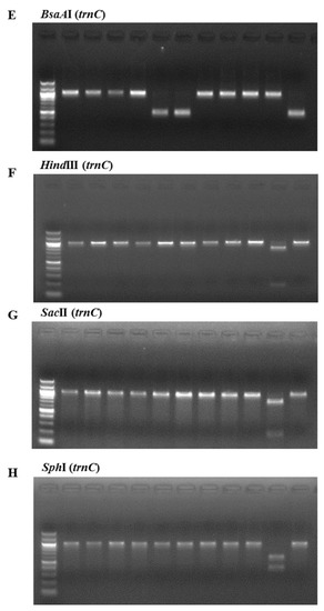 PCR-RFLP profiles of (A) the partial region of rbcL from all tested species digested with BglI; and the partial region of mitochondrial DNA including trnC–trnP digested with (B) Tth111I; (C) AvaII; (D) BsrI; (E) BsaAI; (F) HindIII; (G) SacII; and (H) SphI in P. yezoensis, P. seriata, P. dentata, P. suborbiculata, P. haitanensis, and P. pseudolinearis. Numbers indicate Pyropia samples as described in the Table 2.