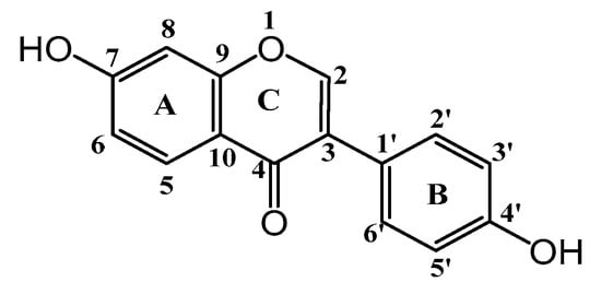 Daidzein (Figure 1) is one of the major isoflavone compounds and exists widely in soybeans [1]. The present study shows that daidzein possesses multiple biological and pharmacological properties such as antioxidant [2,3], anticancer [4,5], anti-inflammatory [6,7], neuroprotective [8], protective treatment of cardiovascular diseases [9], and autoimmune diseases [10]. However, its use in medicines and in functional food ingredients is limited because of its poor solubility and low bioavailability. Various techniques, such as incorporation into a hydrophilic vehicle [11], phosphorylated daidzein [12], and glycosylation [13], etc., have been developed to improve its water solubility and stability. The formation of an inclusion complex with cyclodextrins (CDs) is another promising way to solve this problem.