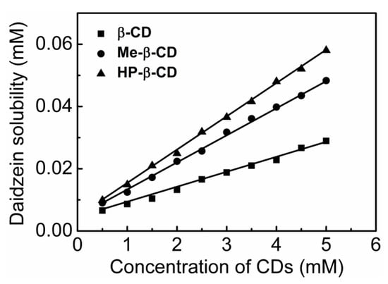 Phase-solubility diagrams of daidzein with β-cyclodextrin (β-CD), methyl-β-cyclodextrin (Me-β-CD), or (2-hydroxy)propyl-β-cyclodextrin (HP-β-CD) at 25 °C.