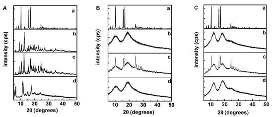 XRD patterns: (A) (a) daidzein, (b) β-CD, (c) daidzein/β-CD physical mixture, (d) daidzein-β-CD inclusion complex; (B) (a) daidzein, (b) Me-β-CD, (c) daidzein/Me-β-CD physical mixture, (d) daidzein-Me-β-CD inclusion complex; (C) (a) daidzein, (b) HP-β-CD, (c) daidzein/HP-β-CD physical mixture, (d) daidzein-HP-β-CD inclusion complex.