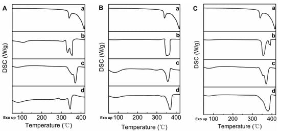 DSC thermograms: (A) (a) daidzein, (b) β-CD, (c) daidzein/β-CD physical mixture, (d) daidzein-β-CD inclusion complex; (B) (a) daidzein, (b) Me-β-CD, (c) daidzein/Me-β-CD physical mixture, (d) daidzein-Me-β-CD inclusion complex; (C) (a) daidzein, (b) HP-β-CD, (c) daidzein/HP-β-CD physical mixture, (d) daidzein-HP-β-CD inclusion complex.