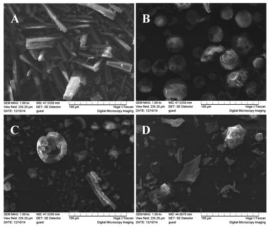 Scanning electron microphotographs: (A) daidzein; (B) HP-β-CD; (C) daidzein/HP-β-CD physical mixture; (D) daidzein-HP-β-CD inclusion complex.