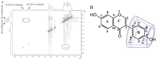 (A) ROESY spectrum of the daidzein-HP-β-CD inclusion complex in D2O at 25 °C; (B) Possible inclusion mode of the daidzein-HP-β-CD inclusion complex.