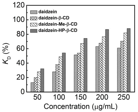 Figure 7 showed a comparison of the DPPH radical-scavenging activity of daidzein, daidzein-β-CD, daidzein-Me-β-CD, and daidzein-HP-β-CD complexes. As shown in our findings, after complexation with CDs had occurred, the scavenging capability of daidzein increased significantly. The order was daidzein-HP-β-CD > daidzein-Me-β-CD > daidzein-β-CD, which indicates that the daidzein-CDs complexes have stronger DPPH radical-scavenging ability than the native daidzein have. The DPPH scavenging capacity of the antioxidant is closely related to its hydrogen-donating ability [37,38,39]. The increasing DPPH scavenging ability of daidzein could be attributed to the enhancement of its hydrogen-donating ability, caused by the complexation of CDs. When daidzein is complexed with CDs, one or more intermolecular hydrogen bonds form between daidzein and the CDs. This weakens the intramolecular hydrogen bonds of daidzein. Ultimately, the hydrogen-donating ability of daidzein is improved.