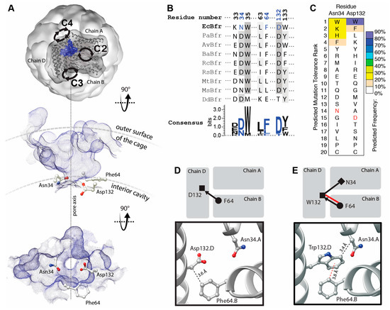 The B-site protein–protein interfaces of BFR are located midway between the twofold, threefold and fourfold symmetric interfaces (Figure 1A, top). The protein–protein contacts around the B-site interfaces are not symmetric, and therefore the occurrence of mutations is not multiplied by a symmetry factor. Topographic analysis reveals that these interfaces contain a solvent-accessible pocket. Pockets detected at the B-sites encompass a channel that connects the interior cavity to the bulk solution outside of the cage. These channels are termed “B-site pores”, according to Macedo et al. [20]. Three residues—Asn34, Phe64 and Asp132—are involved in the constriction of B-site pores. We hypothesized that positions 34 and 132 could host aromatic residues to create a network of aromatic interactions across the B-site pores through interactions with Phe64 and stabilized the interfaces.
