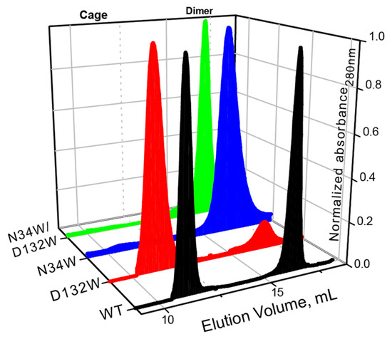Similar to what we have previously shown, the wild-type BFR elutes as two major peaks with elution volumes corresponding to dimer and 24-mer oligomerization states (Figure 2). In the case of D132W, one of the variants with a redesigned B-site, the dimer peak is smaller than the 24-mer, suggesting that the predicted mutation favors the formation of the higher-order assembly. The ratio of the 24-mer to dimer population in the redesigned mutant is larger than that of wild-type BFR, suggesting that we were successful in designing proteins with enhanced assembly properties. The other two mutants—N34W and D132W/N34W—only formed dimers in solution, indicating that these mutations cripple the ability of protein to form the cage state in solution.