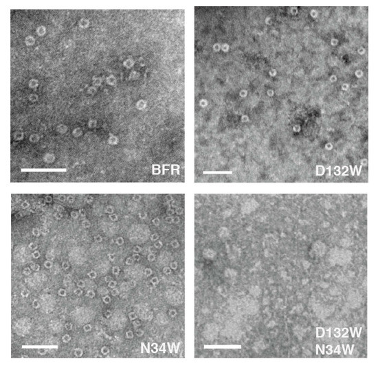 Two of the three BFR-derived mutants can form nano-cages under TEM conditions, the exception being D132W/N34W. Scale bars indicate 50 nm.