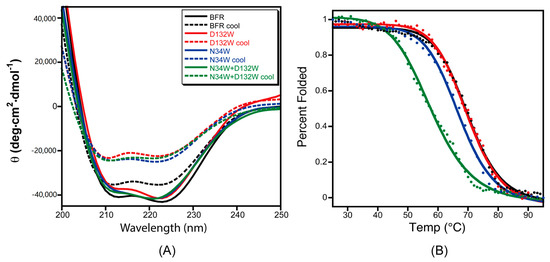 To test the effect of the designed B-site mutations on the thermal stability of BFR, the designed protein variants were subjected to thermal denaturation monitored by CD. The far-UV CD spectra of the proteins in phosphate buffer showed the characteristic double negative minima of α helical secondary structures at 208 nm and 222 nm (Figure 5A). The temperature-dependent CD spectra of the proteins with redesigned B-site interfaces were obtained by scanning the temperature from 25–95 °C. The α-helicity decreased with increasing temperature due to thermal denaturation (Figure 5A). Moreover, unfolding of all of the wild-type BFR and mutant proteins was shown to be partially reversible when the protein samples were slowly cooled from 95 to 25 °C (Figure 5B), making it possible to extract quantitative thermodynamic information on the stability of these proteins from thermal unfolding spectra. Therefore, the negative peak at 222 nm was monitored with respect to temperature to investigate the thermal stability of the proteins.