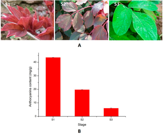 Images of P. qiui leaf and anthocyanin contents at three stages (S1: leaf does not spread fully; S2: leaf spread fully; and S3: flower just faded). (A) Images of P. qiui leaf at three different stages; and (B) contents of anthocyanin in three different leaf stages.