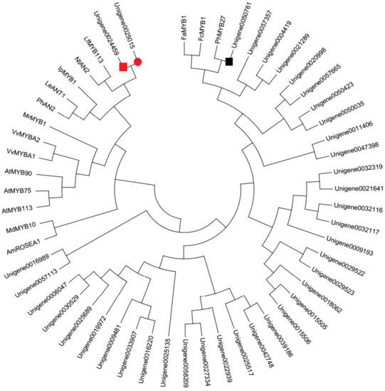 Apart from enzyme genes, forty MYB genes were identified from DEGs in this study (Supplementary Table S3). In order to identify the candidate MYBs involved in anthocyanin biosynthesis, the phylogenetic analysis with the deduced amino acid sequences of these forty MYBs and other MYBs involved in anthocyanin biosynthesis was conducted (Figure 3). The phylogenetic tree showed that Unigene0024459 grouped into an anthocyanin promoting MYB clade, which included Arabidopsis thaliana AtMYB75 and AtMYB113, Nicotiana tabacum NtAN2, Petunia hybrid PhAN2, Lycopersicon esculentum LeANT1, Vitis vinifera VvMYBA1 and VvMYBA2, Antirrhinum majus AmROSEA1, Myrica rubra MrMYB1, Malus domestica MdMYB10, etc., while Unigene0050761 was in the same clade with FaMYB1, FcMYB1, and PhMYB27, which were proven to be the repressor of anthocyanin biosynthesis [16].