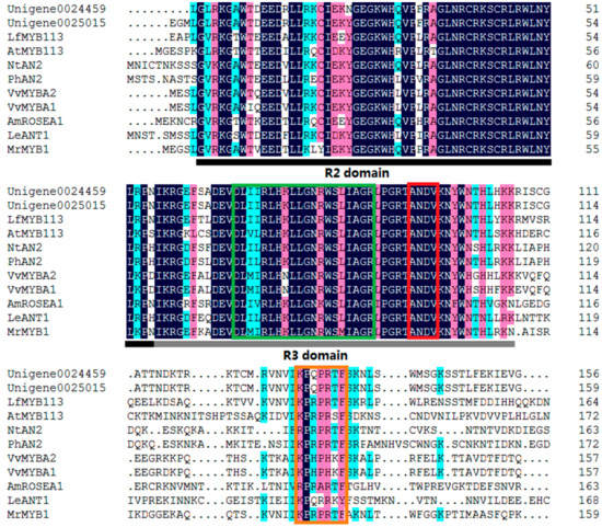 The alignment analysis of the deduced amino acid sequence of Unigene0024459 with those of other MYBs related to anthocyanin biosynthesis was conducted. Like other MYBs, Unigene0024459 contained the highly-conserved R2R3 domain at the N-terminus (Figure 4). All of them contained a conservative [K/R]Pxxx[K/T][F/Y] sequence in the C-terminal. This short, the conserved sequence was part of the signature motif for MYBs that positively regulated anthocyanin biosynthesis in vegetative or reproductive tissues [17]. Additionally, another conservative ANDV sequence at position 90–93 in the R3 domain was found in Unigene0024459. This conserved sequence was also the signature motif for the anthocyanin-promoting MYBs [17], which indicated that Unigene0024459 was a R2R3 MYB and likely promoted the anthocyanin biosynthesis in P. qiui. Meanwhile, Unigene0024459 contained the motif of [D/E]Lx2[R/K]x3Lx6Lx3R in the R3 domain that is responsible for interaction with the R-like bHLH protein [18], suggesting that Unigene0024459 possibly recruited some R-like bHLH proteins as cofactors during transcriptional regulation.