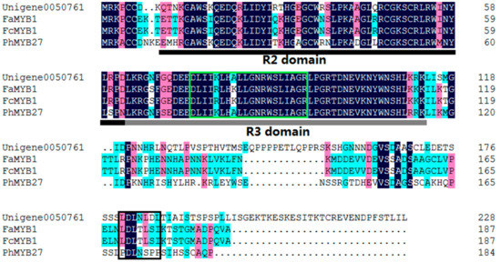 The deduced amino acid sequence alignment of Unigene0050761 with MYBs which repress anthocyanin biosynthesis in other species. Alignment was conducted using DNAMAN Version 6. R2 and R3 domains are indicated. The black box shows the EAR motif, and the green box shows the motifs that were involved in the bHLH interaction.