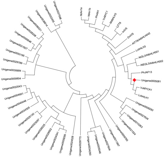Forty bHLH genes were identified from DEGs (Supplementary Table S4) in this study. The phylogenetic analysis with the deduced amino acid sequences showed that Unigene0005081 grouped into an anthocyanin biosynthesis-related bHLH clade, which included Arabidopsis thaliana AtGL3, AtEGL3, and AtTT8, Nicotiana tabacum NtAn1a and NtAn1b, Petunia hybrida PhAN1 and PhJAF13, Vitis vinifera VvMYCA1 and VvMYC1, Malus domestica MdbHLH3, Dahlia pinnata DvIVS, etc. (Figure 6). The deduced amino acid sequence alignment showed that Unigene0005081 contained box 11, 18 and 13 domain at the N-terminus (Figure 7), which was important for the interaction of bHLH and MYB [21]. These indicated that Unigene0005081 was likely involved in regulating the anthocyanin biosynthesis in P. qiui.