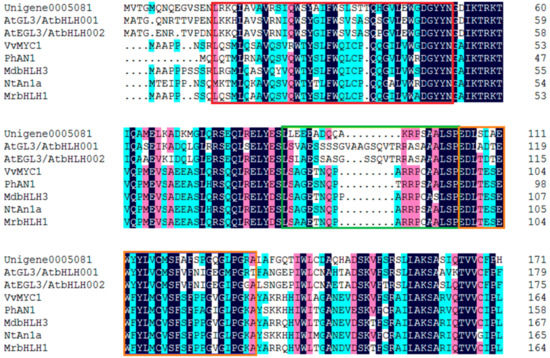 The deduced amino acid sequence alignment of Unigene0005081 with bHLHs which regulate anthocyanin biosynthesis in other species. Alignment was conducted using DNAMAN Version 6. The red box shows the box 11 motif, the green box shows the box 18 motif, and the orange box shows the box 13 motif.