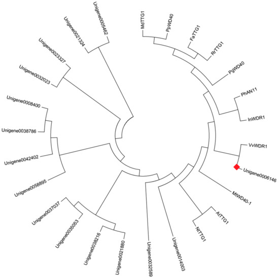 Apart from MYBs and bHLHs, 15 WD40 transcription factors were also found from DEGs (Supplementary Table S5). The phylogenetic analysis with the deduced amino acid sequences showed that Unigene0006146 was in the same clade with VvWDR1, PhAN11, MdTTG1, PgWD40, InWDR1, NtTTG1, and AtTTG1 (Figure 8). These WD40 transcription factors participated in regulating the anthocyanin biosynthesis. It predicted that Unigene0006146 likely participated in regulating the anthocyanin biosynthesis in P. qiui.