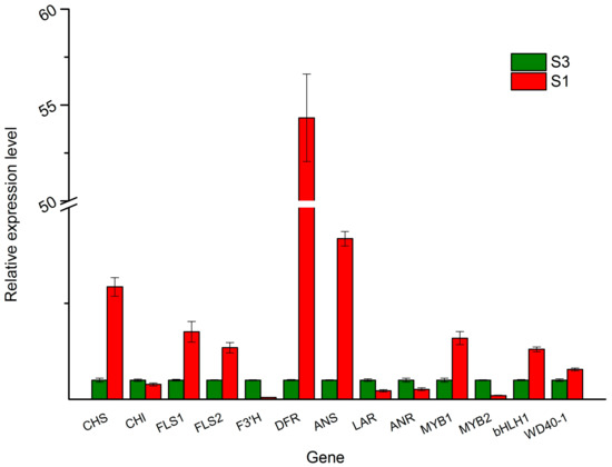 The expression patterns of DEGs involved in anthocyanin biosynthesis revealed by q-PCR. Unigene0017118 (CHS), Unigene0016797 (CHI), Unigene0030889 (DFR), Unigene0012475 (ANS), Unigene0014577 (LAR), Unigene0040486 (ANR) Unigene0041187 (F3'H), Unigene0054556 (FLS1), Unigene0052849 (FLS2), MYB1 (Unigene0024459), MYB2 (Unigene0050761), bHLH1 (Unigene0005081), and WD40-1 (Unigene0006146).