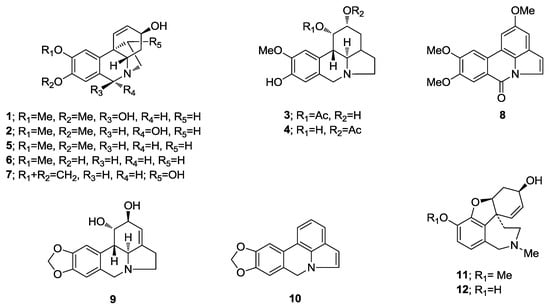 - Carvalho, K.R.; Silva, A.B.; Torres, M.C.M.; Pinto, F.C.L.P.; Guimaraes, L.A.; Rocha, D.D.; Silveira, E.R.; Costa-Lotufo, L.V.; Braz-Filho, R.; Pessoa, O.D.L. Cytotoxic Alkaloids from Hippeastrum. solandriflorum Lindl. J. Braz. Chem. Soc. 2015, 26, 1976–1980. [Google Scholar] [CrossRef]