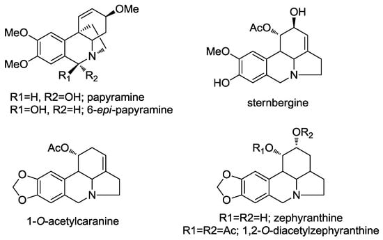 - Evidente, A.; Iasiello, I.; Randazzo, G. Isolation of sternbergine, a new alkaloid from bulbs of Sternbergia. lutea. J. Nat. Prod. 1984, 47, 1003–1008. [Google Scholar] [CrossRef]