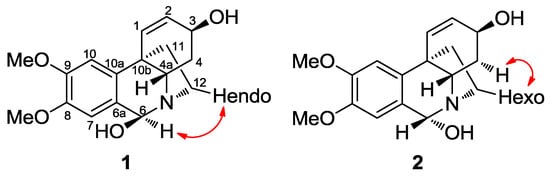 Compounds 1 and 2 were obtained together from an acetate leaf fraction and isolated as a mixture, which was not separated by conventional chromatographic methods. The HRMS data of compounds 1 and 2 suggested the molecular formula C17H22NO4 for the parent ion [M + H]+ at m/z 304.1544 (calcd 304.1543). The absolute configuration of these epimers was determined by circular dichroism (CD). The curve and shape were qualitatively similar to those of known haemanthamine-type alkaloids, with the 5,10b-ethano bridge in an α-orientation, having a minimum of 250 nm and a maximum of around 285 nm. The 1H-NMR data of compounds 1 and 2 (Table 2) were similar to the data published for papyramine and 6-epi-papyramine [27] (Figure 2). The spectrum showed two singlets at δ 5.35 and 6.12 due to the benzylic H-6 proton for epimers 1 and 2, respectively. Two double doublets of the olefinic protons at δ 5.98 and 6.02 were assignable to the H-2 protons of both epimers (compounds 1 and 2, respectively) due to their coupling with the H-1 doublets at 6.59 and 6.51 ppm, respectively. The value of the H-2/H-3 coupling constant (J = 5.3 and 5.1 Hz, respectively) was in agreement with a β-orientation of the hydroxyl group at C-3. The assignment of the aromatic protons was made on the basis of the relative intensities of the signals of both epimers and the benzylic coupling between H-6 and H-7, observed in the 2D COSY experiment. Two signals for the methoxy groups at δ 3.90 and 3.87 were observed, both of them integrating 4.3 protons (since epimers 1 and 2 were in a ratio of 3:1). The protons H-4a and H-4ax showed a large coupling (J = 13.6 and 13.8 Hz, compound 1 and 2, respectively), due to their trans diaxial configuration. The NOESY contour between H-6α and H-12endo allowed us to assign the β-orientation of the hydroxyl group in compound 1 (Figure 3). The coupling between H-12exo and H-4α allowed us to establish the conformational orientation of these protons in compound 2 (Figure 3). All the signals were confirmed by 2D-NMR.