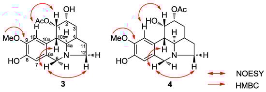 Compounds 3 and 4 were obtained from an acetate bulb fraction and isolated as a mixture due to limited sample availability. The HRMS data of compounds 3 and 4 suggested the molecular formula C17H22NO4 for the parent ion [M + H]+ at m/z 334.1651 (calcd 334.1649). The 1H-NMR data summarized in Table 3 were similar to those reported for zephyranthine, 1,2-O-diacetylzephyranthine [28] and sternbergine [29] and 1-O-acetylcaranine [30] (Figure 2). A correlation between the protons of the methoxy group and H-10 in the 2D NOESY spectrum allowed us to assign this group at C-9 in both compounds (Figure 4). The two double doublets at δ 3.11 (J = 5.9 and 10.4 Hz) and 3.22 (J = 5.9 and 10.7 Hz) were attributed to the H-4a position in compounds 3 and 4, respectively. The large coupling constant supported a trans-fusion of the B/C rings in both structures. The location and axial configuration of the radical group at C-1 in compounds 3 and 4, respectively, were deduced from COSY and NOESY experiments (Figure 4). In compound 3, the low magnetic field location of the H-1 and H-2 protons (δ 6.01 and 4.15 ppm, respectively) in the 1H spectrum allowed us to determine the presence of an acetyl group at C-1 and a hydroxyl group at C-2, respectively. Conversely, in compound 4, the low magnetic field of the H-1 and H-2 protons (δ 4.77 and 5.12 ppm, respectively) indicated a hydroxyl group at C-1 and an acetyl group at C-2, respectively. In these compounds, the equatorial H-1 resonated as a triplet at δ 6.01 (J = 3.9 Hz) and 4.77 (J = 1.5 Hz), respectively, and was coupled to H-10b and H-2 in the COSY spectrum, and to H-10 in the NOESY experiment (Figure 4). These data and the large constant coupling between H-2 and H-3α in compounds 3 and 4 (J = 9.8 and 11.6 Hz, respectively) allowed us to assign the equatorial configuration of the substituent at C-2. From the HMBC spectrum, three bond correlations were observed for H-7 to C-9, H-10 to C-8, H-7 to C-10a and H-10 to C-6a, enabling us to identify the resonances of the quaternary carbons C-8, C-9, C-6a and C-10a. In addition, a three-bond coupling between the methoxy protons and C-9 confirmed the NOESY result (Figure 4).