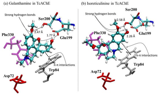 The molecular docking results reported in Table 5 are analyzed here in terms of different interactions between the alkaloids and active site of the TcAChE protein: hydrogen bonds, π-π stacking and anionic interactions. Regarding hydrogen bonding, galanthamine showed the highest stability due to two strong interactions with the Glu199 and Ser200 residues, while the isoreticulinine complex presented only one interaction with the Ser200 residue. Both these alkaloids have a similar localization according to π-π stacking, interactions with Trp84, Phe330 and Asp72 residues, and anionic stabilization. The hydrogen bond interaction of reticulinine (3) is as depicted in Figure 5 for isoreticulinine (4), with a distance close to 1.9 A. The hydrogen bond interactions for 6β-hydroxymaritidine (1) and 6α-hydroxymaritidine (2) are similar, although anionic and π-π stacking interactions suggest a different, more distant localization, in accordance with the binding free energies reported in Table 5.