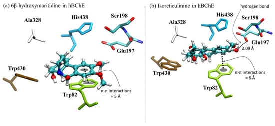 In the case of BuChE, 4BDS in the PDB code, the crystallographic data show that tacrine, a molecule for anti-Alzheimer’s drugs targeting acetyl- and butyryl-cholinesterase, is stabilized by π-π stacking interactions between the aromatic rings and the Trp82 residue; additionally, this ligand is stabilized by the presence of hydrophobic interactions with Trp430, Ala328 and His438. On the other hand, similar to TcAChE, the active site shows the presence of two available residues available for hydrogen bond interactions, Glu197 and Ser198. In terms of π-π stacking interactions, Figure 6 shows that 6β-hydroxymaritidine (1) is more stable than isoreticulinine (4). However, the localization of 6β-hydroxymaritidine in the active site is not appropriate for forming hydrogen bonds with the Glu197 and Ser198 residues. The results suggest that in an ideal BuChE inhibitor π-π stacking and hydrogen bond interactions should be in equilibrium, and among the tested molecules isoreticulinine was closest to this definition. In terms of hydrophobic interactions, all molecular docking analyses reported similar interactions between the alkaloids and Trp430, Ala328 and His438 residues.