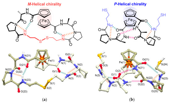 - Moriuchi, T.; Nishiyama, T.; Nobu, M.; Hirao, T. Control of helical chirality of ferrocene-dipeptide conjugates by the secondary structure of dipeptide chains. Chem. Eur. J. 2017, 23, 12704–12708. [Google Scholar] [CrossRef] [PubMed]