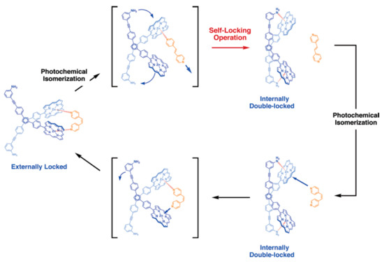 - Muraoka, T.; Kinbara, K.; Aida, T. A self-locking molecule operative with a photoresponsive key. J. Am. Chem. Soc. 2006, 128, 11600–11605. [Google Scholar] [CrossRef] [PubMed]