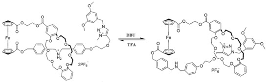 - Li, H.; Zhang, H.; Zhang, Q.-W.; Qu, D.-H. A switchable ferrocene-based [1]rotaxane with an electrochemical signal output. Org. Lett. 2012, 14, 5900–5903. [Google Scholar] [CrossRef] [PubMed]